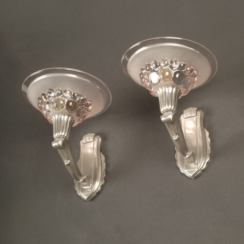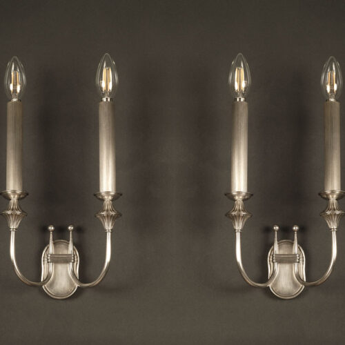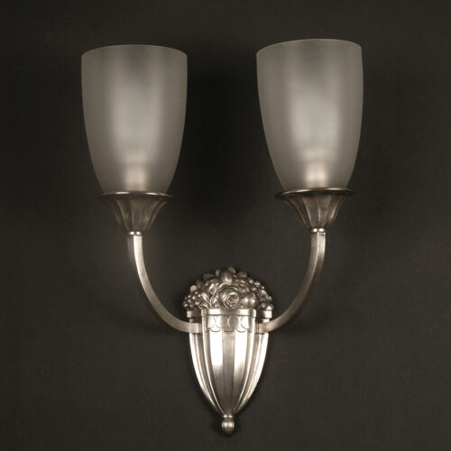 Louis Gagnon : applique double Art Déco en bronze argenté et verre satiné. Cette élégante applique double en bronze argenté de la fin des années 1920, est constitué d’une platine en forme de vase au bouquet de roses modernes. Deux bras remontants à section carrée avec leurs coupelles cache-douilles à godrons bas. Une barre d’accrochage est présente à l’arrière de la platine ainsi que la signature « GAGNON » (voir image n° 10). La verrerie est composée de deux fines tulipes en verre moulé dépoli satiné blanc. Gagnon garnissait souvent ses luminaires de ces années-là avec de la verrerie à simple dépoli (voir image n° 13). Les deux points lumineux sont à douille baïonnette culot B22.