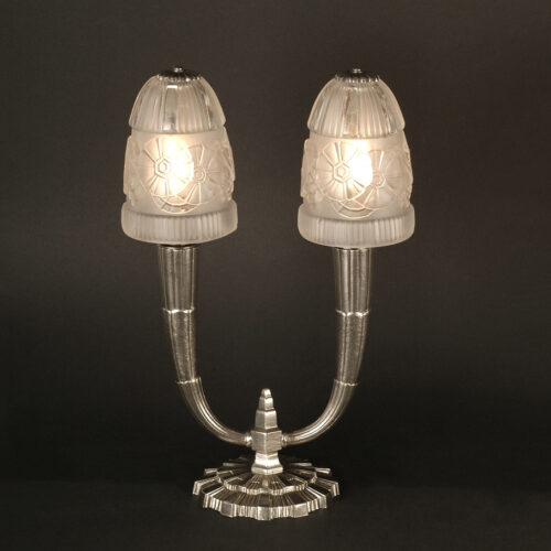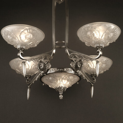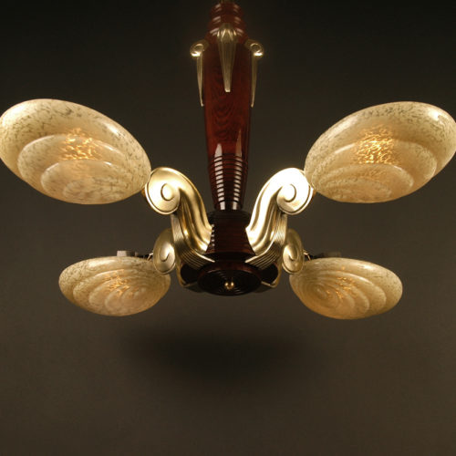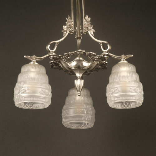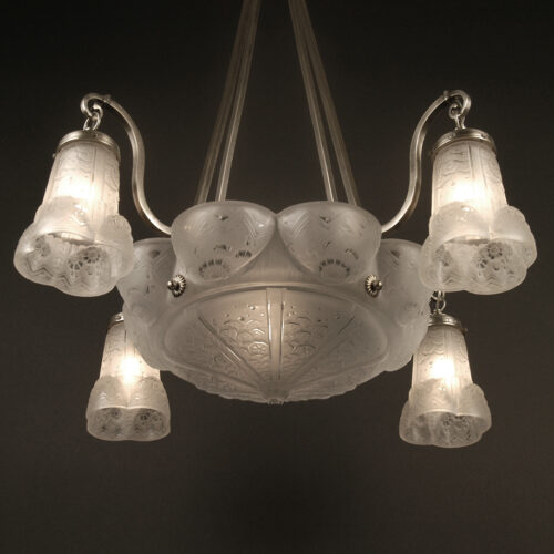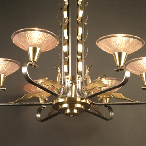 Augustin Vlieghe et Fils/Degué : lustre Art Déco en ferronnerie d’art et verre moulé-pressé. Le lustre proposé ici à la vente du ferronnier d’art Augustin Vlieghe et Fils est présent dans un de ces catalogues du début des années 1930 sous le numéro de référence 421 (voir images n° 15-17). Vlieghe était un des rares fabricants à indiquer sur ces catalogues le nom du fabricant des verreries, dans ce cas spécifique, Degué. La monture d’une belle facture d’exécution, est composée d’un tambourin avec décors de volutes et triangles, avec quatre branches en tortillon. Quatre tiges elliptiques égayées des décors en rectangles obliques façonnés différemment. Un cache-bélière hexagonal martelé et quatre griffes à feuilles en mouvement. Il faut remarquer que les griffes ne sont pas les mêmes que celles du catalogue, mais elles sont bien du fabricant qui les utilise régulièrement selon son montage. Le verrerie, comme bien est indiqué sur le catalogue d’époque, est une verrerie moulée-pressée signée Degué, produites aux Cristalleries de Compiègne (voir images n° 18-19). Une vasque-obus central (n° 531 du catalogue) et quatre tulipes à col de griffe (n° 519 du catalogue). Toutes les verreries sont griffées de la marque « Degué ».