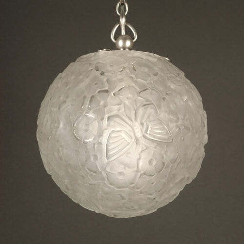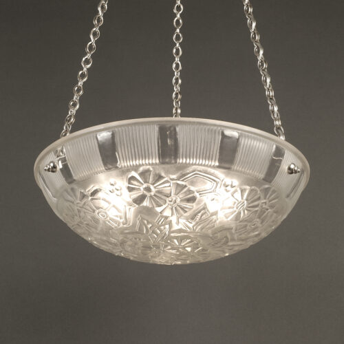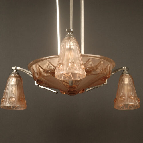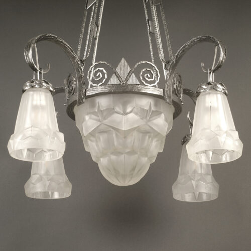 A. VLIEGHE ET FILS/DEGUÉ : LUSTRE ART-DÉCO FERRONNERIE D’ART ET VERRE MOULÉ-PRESSÉ