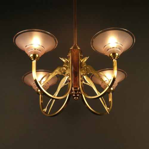 Ajouter au panier LUSTRE ART DÉCO DEGUÉ « LES FAISANS », BRONZE, LAITON, BOIS VERNIS ET VERRE MOULÉ 840,00€