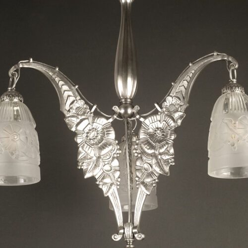 Anciens Établissements L. Eliot-Verrerie des Hanots : lustre Art Déco en bronze argenté et verre moulé-pressé. Le lustre proposé ici à la vente, est une fabrication des Anciens Établissements Louis Eliot dont le siège et les importants ateliers se situaient à Paris entre les numéros 19 et 25 du passage Charles-Dallery dans le 11e arrondissement. La monture est constituée d’une pièce centrale à trois bras d’appliques richement décorés sur un thème floral stylisé. Un fût central à facettes et un cache-bélière aussi richement décoré sur le thème floral stylisé. Chaque douille présente les caches-douilles spécifiques des luminaires de cette maison. D’autres pièces de ce lustre sont aussi employées maintes fois par le fabricant dans ses luminaires comme c’est le cas du cache-bélière et de la boule de raccord. Les luminaires de l’ancienne maison Eliot, ont aussi la particularité de présenter assez souvent un manque de conduit (tiges) creux pour passer les câbles dans les branches. Un acheminement avec des guides est toujours présent. Le monogramme utilisé par Louis Eliot était un « E », monogramme repris par ses successeurs. Ils ne sont pas toujours visibles dans tous ses luminaires.