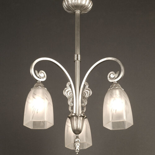 LUSTRE ART DÉCO ETS GILLES EN BRONZE ARGENTÉ ET VERRE PRESSÉ DÉPOLI ET TAILLÉ