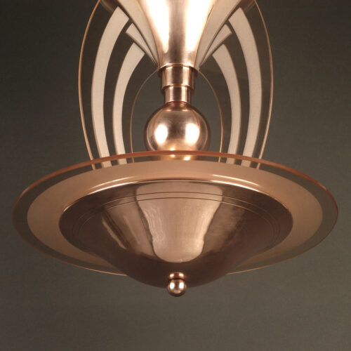 Détails Out of stock PETITOT/SAINT-GOBAIN : LUSTRE-SUSPENSION ART DÉCO EN BRONZE CUIVRÉ ET GLACE DÉPOLIE