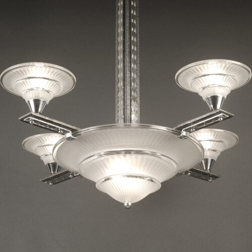 Model-Verdun : lustre Art Déco en ferronnerie d’art, bronze nickelé et verre moulé-pressé. Le modèle proposé ici à la vente, est constitué d’une monture en fer forgé dont un croisillon à la base et un fût à section carrée paré des décors en bronze fondu nickelé. À chaque extrémité du croisillon, un point lumineux avec ses cache-douilles en laiton nickelé. Un cache-bélière en pyramide tronquée et décors martelés. La verrerie est composée d’une vasque centrale de 35 cm de diamètre et quatre coupelles à gradins en verre moulé-pressé dépoli blanc aux motifs rayonnants et des réserves claires. Cette verrerie, jamais marquée par son fabricant, est une production de Maurice Model et sa Cristallerie de Verdun. Ce modèle de verrerie était décliné en vasque, coupelles et tulipes aux coloris blanc ou rose. On retrouve le même traitement et les mêmes codes de fabrication dans d’autres modèles qui eux sont marqués par le fabricant. Les six points lumineux sont à douille baïonnette culot B22, dont deux à l’intérieur de la vasque et quatre par chaque coupelle.