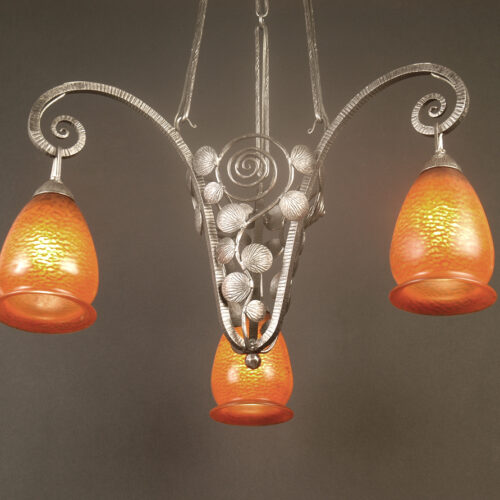 Marcel Vasseur/ André Delatte : lustre Art Déco en ferronnerie d’art et pâte de verre. Le modèle proposé ici à la vente est une fabrication de la fin des années 1920, du ferronnier d’art Marcel Vasseur. Le lustre est composé d’une partie principale en une seule pièce type panier avec trois branches qui finissent en volutes avec des décors en feuilles de « monnaie du Pape ». Ce décor est très utilisé par Vasseur dans ses luminaires : lustres, lampes, etc. Trois chaînes à maillons longs intercalés d’anneaux. Le cache-bélière est aussi une pièce maintes fois utilisée par le ferronnier. Sur l’image n° 13, extrait d’un des catalogues du ferronnier, on peut voir parfaitement l’utilisation de tous ces éléments dans deux lustres avec une configuration presque similaire. Trois tulipes en pâte de verre aux tons ocres et orangés du verrier André Delatte complètent le lustre. Chaque tulipe est signée à l’acide « Delatte Nancy », difficile à rendre en photographie.