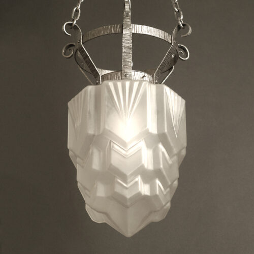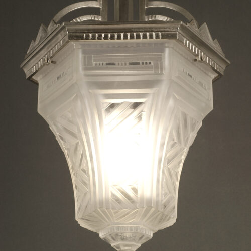 Maynadier/Muller Frères : lanterne-suspension en bronze argenté et verre moulé-pressé. Cette élégante lanterne est présente dans un catalogue de Maynadier du début des années 1930 sous la référence n° 503 (voir image n° 10). Elle est constituée d’une monture en bronze argenté équipée d’un cerclage hexagonal aux décors géométriques, un fût central à section hexagonale est trois bras de tensions aussi aux motifs géométriques. Un cache-bélière étoilé qui reprend le thème de la géométrie. Le monogramme de Pierre Maynadier, est présent sur le cerclage, accompagné du numéro de modèle, à savoir, « 503 M P 3 ».