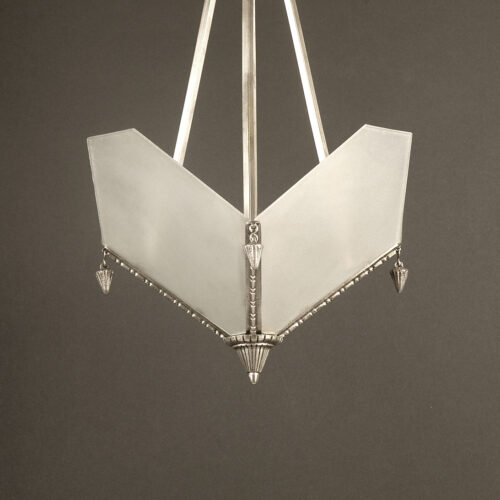Louis Gagnon : applique double Art Déco en bronze argenté et verre satiné. Cette élégante applique double en bronze argenté de la fin des années 1920, est constitué d’une platine en forme de vase au bouquet de roses modernes. Deux bras remontants à section carrée avec leurs coupelles cache-douilles à godrons bas. Une barre d’accrochage est présente à l’arrière de la platine ainsi que la signature « GAGNON » (voir image n° 10). La verrerie est composée de deux fines tulipes en verre moulé dépoli satiné blanc. Gagnon garnissait souvent ses luminaires de ces années-là avec de la verrerie à simple dépoli (voir image n° 13). Les deux points lumineux sont à douille baïonnette culot B22.