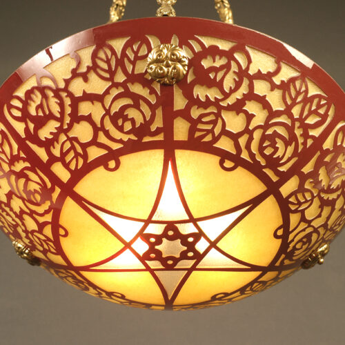 SUSPENSION VASQUE ART DÉCO BRONZE, LAITON ET VERRE PEINT ÉMAILLÉ