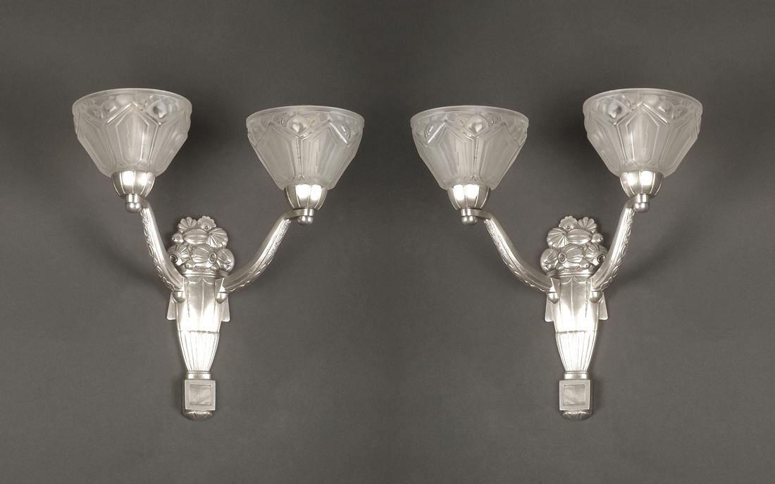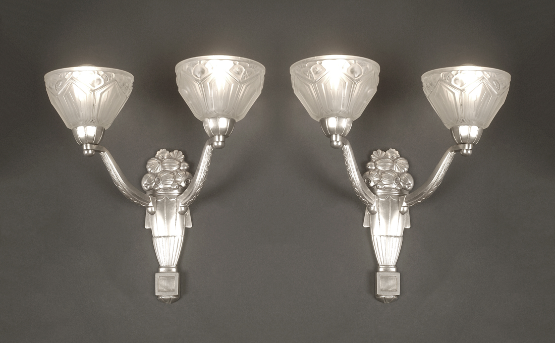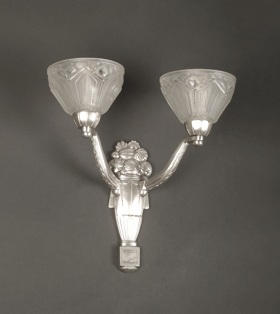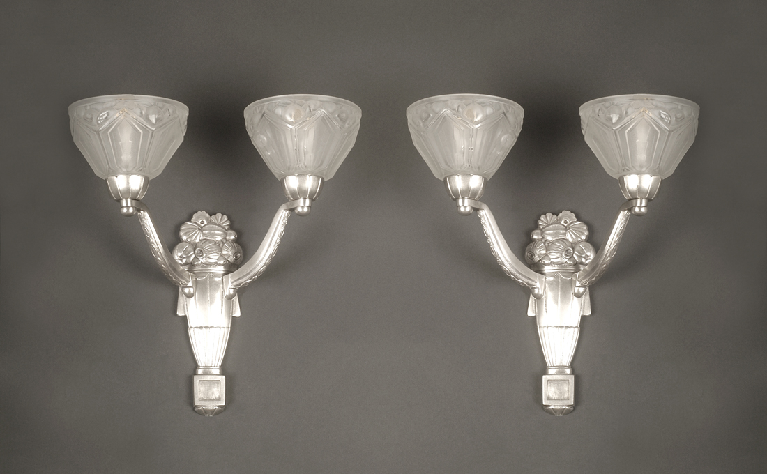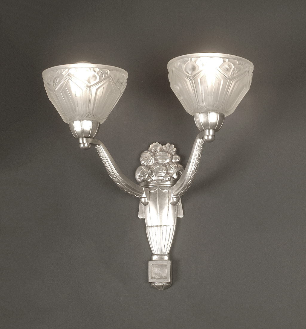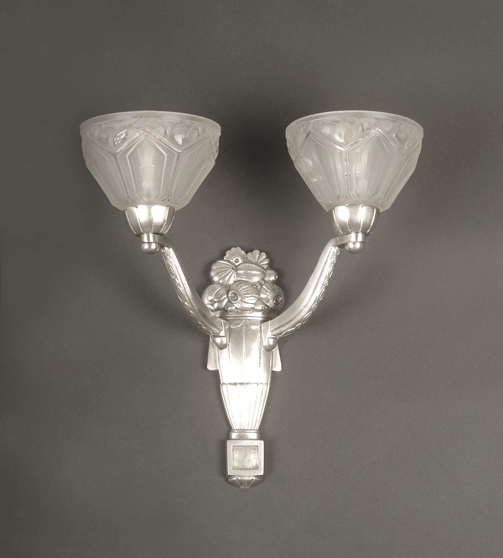 Antoine Fichet/Verrerie des Hanots : paire d’appliques doubles feux en bronze argenté et verre moulé-pressé. Cette paire d’appliques de la fin des années 1920 est une production du bronzier d’éclairage lyonnais Antoine Fichet. Les appliques, en bronze argenté, sont constituées d’une platine coiffée d’une corbeille de fruits et de fleurs stylisées. Deux bras d’appliques décorés et leurs cache-douilles à godrons modernes. Chaque platine est marqué de l’empreinte du fabricant : A. Fichet Lyon (voir image n° 12). Un trou d’accrochage est présent à l’arrière de platines. Les quatre points lumineux sont à douilles baïonnette culot B22.