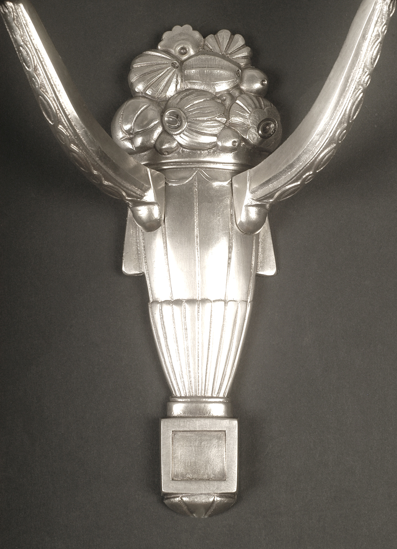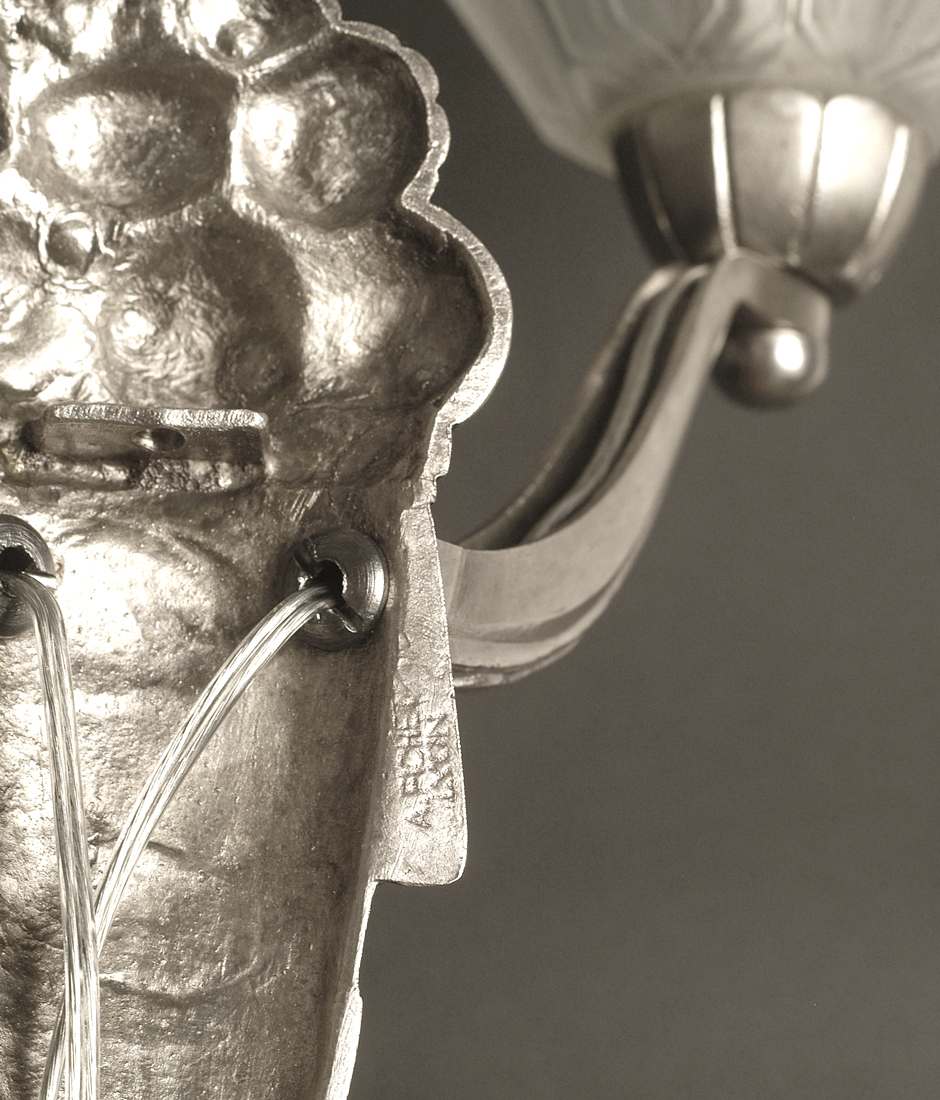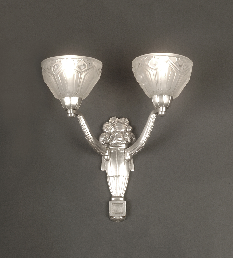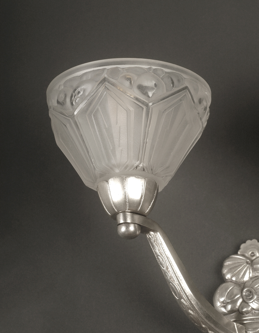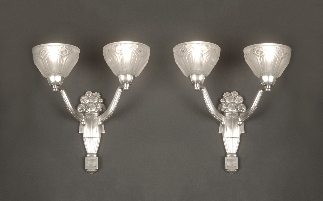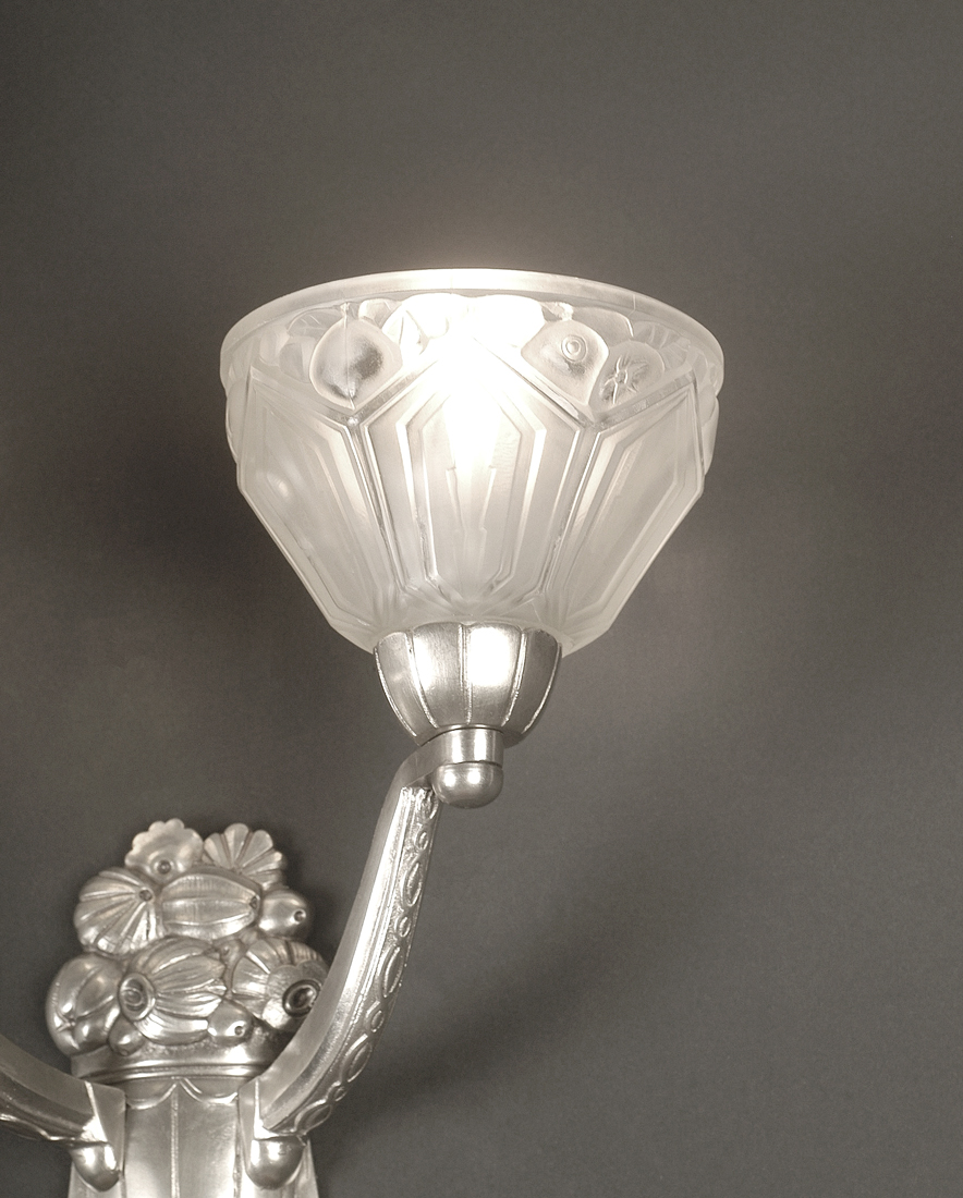 Antoine Fichet/Verrerie des Hanots : paire d’appliques doubles feux en bronze argenté et verre moulé-pressé. Cette paire d’appliques de la fin des années 1920 est une production du bronzier d’éclairage lyonnais Antoine Fichet. Les appliques, en bronze argenté, sont constituées d’une platine coiffée d’une corbeille de fruits et de fleurs stylisées. Deux bras d’appliques décorés et leurs cache-douilles à godrons modernes. Chaque platine est marqué de l’empreinte du fabricant : A. Fichet Lyon (voir image n° 12). Un trou d’accrochage est présent à l’arrière de platines. Les quatre points lumineux sont à douilles baïonnette culot B22.