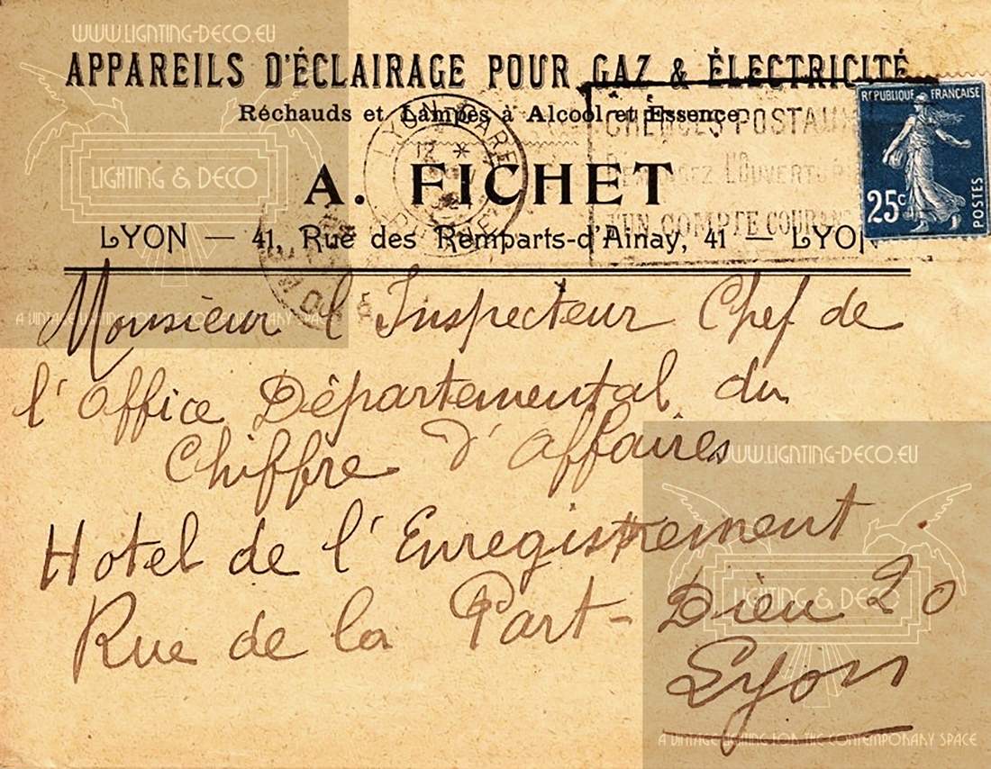 Antoine Louis Fichet (Lyon, 1869 – 1930), fils d’un tourneur en cuivre, commence son activité, comme son père, en tant que tourneur en cuivre. Il crée sa fabrique de bronzes d’éclairage en 1896 à deux pas de son lieu de naissance au 41 rue des Remparts d’Ainay, adresse qu’il gardera tout au long de sa carrière professionnelle (voir image n° 13). En 1912, il apparaît comme bronzier d’éclairage. Inscrit au registre de commerce de Lyon en janvier 1921 comme fabricant de bronzes d’éclairage sous son propre nom : Fichet. La société, sous cette dénomination, sera active jusqu’à sa radiation en février 1931 à cause du décès d’Antoine Fichet survenu le 23 décembre 1930. Après sa mort, Fichet, étant lui-même veuf, la société est vendue à deux associés : Mme veuve Janisson et Jules Dégrey ou Digrey. Ces deux derniers garderont la société un certain temps, puis c’est René Francois Fonville qui rachète la société jusqu’à la faillite définitive en août 1936.