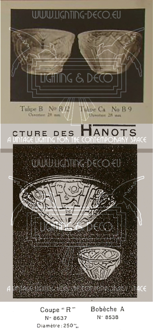 La verrerie est composée de quatre coupelles en verre moulé-pressé dépoli blanc aux motifs géométriques et avec des décors de fruits stylisés en accord avec les décors des platines. Cette verrerie, non signée, est bien connue de la production des Verreries des Hanots, présente dans le catalogue d’époque du fabricant (voir image n° 14). Dans la même série, une vasque, un dôme et une tulipe sont assortis. La fabrication de verrerie d’éclairage de la société Holophane, dont l’usine était située à Les Andelys (département de l’Eure), était signée sous la marque « Des Hanots », mais rarement dans les petites pièces tellles tulipes et coupelles. La Verrerie des Hanots, faisait partie de la société Holophane France, dont l’usine de production se trouvait aux Andelys, dans l’Eure. La signature « Des Hanots » correspondait à celle de la fabrication des verreries d’art et de décoration telle la verrerie d’éclairage, les vases, les sculptures, et la verrerie d’architecture. En 1930, Holophane France devient la Société Anonyme Holophane, société entièrement française et complètement indépendante des entités anglaises et américaines.