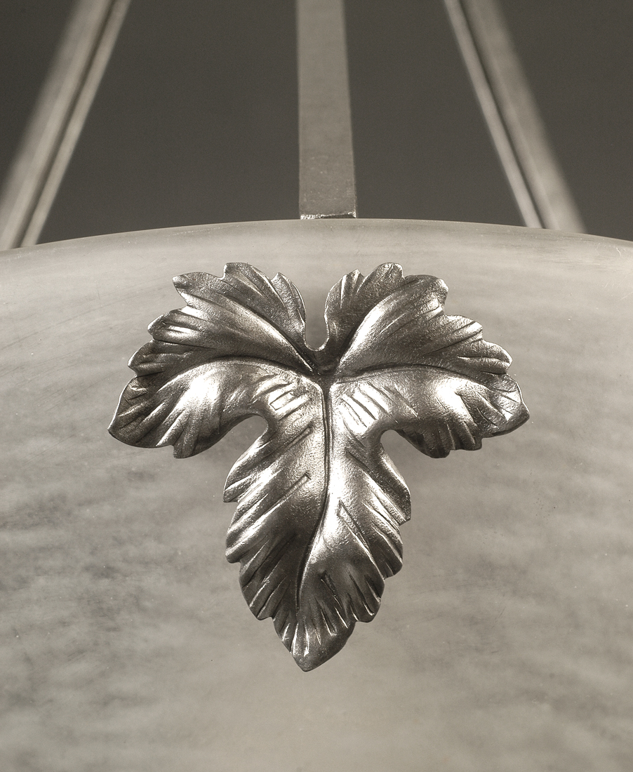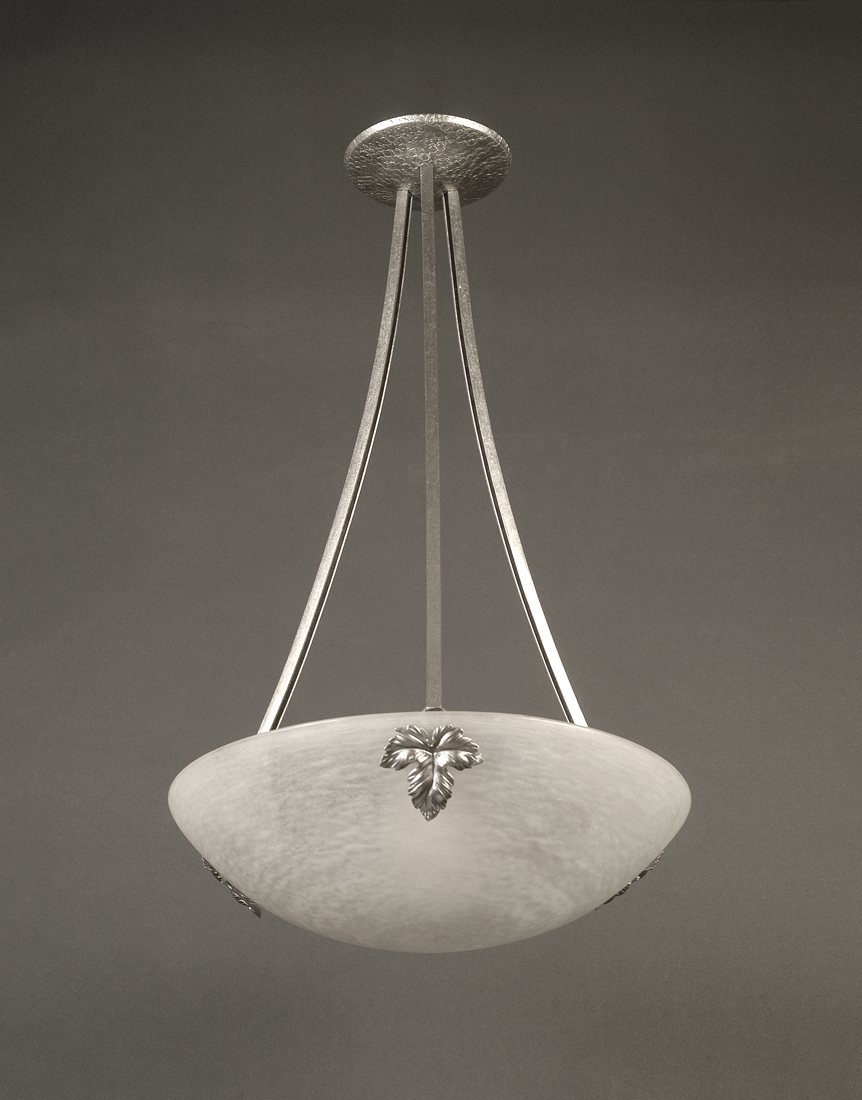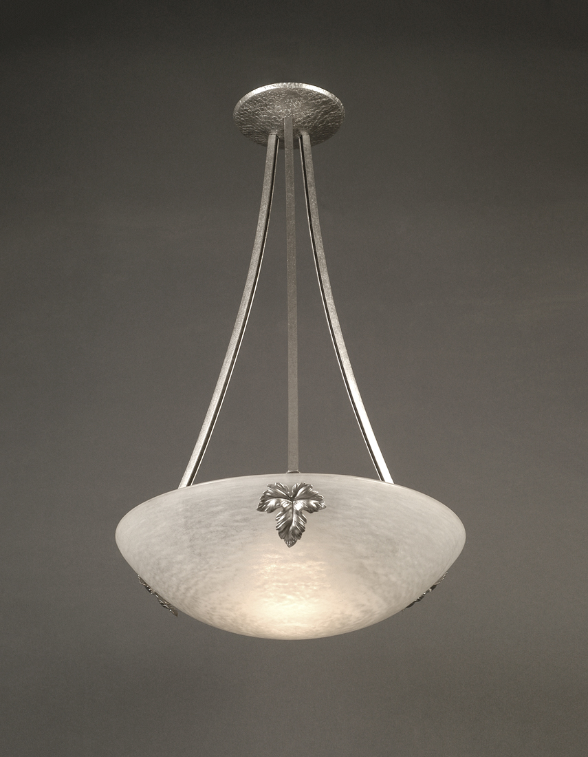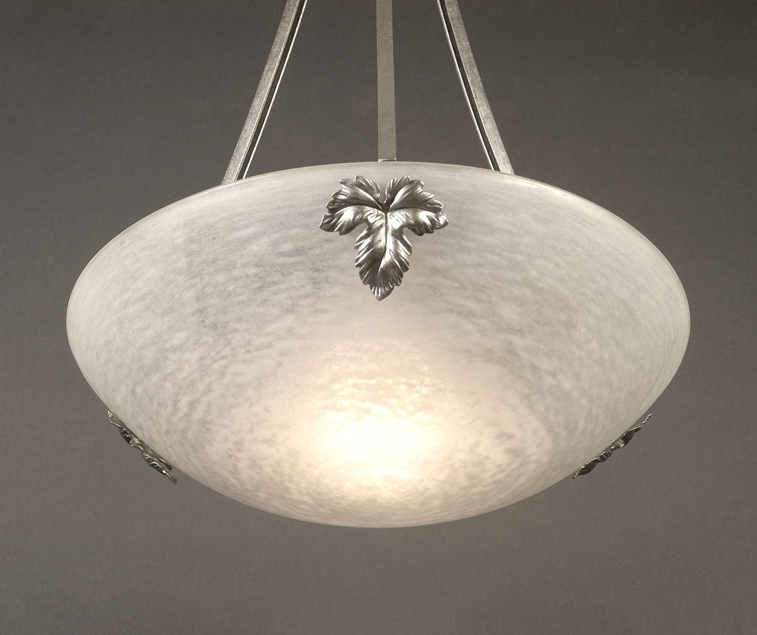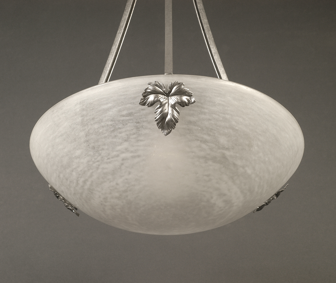 Schneider : suspension vasque Art Déco en ferronnerie d’art et pâte de verre moucheté blanche. La suspension ici en vente, est constituée d’une monture en fer forgé avec trois tiges à suspente à section carrée avec un creux pour le passage des câbles électriques, trois points d’attache avec des décors de feuilles de vigne vierge et un cache-bélière rond martelé. La vasque, d’un diamètre de 40 cm, est en pâte de verre mouchetée blanche du fabricant d’Épinay-sur-Seine Charles Schneider. La signature à était sans doute effacée par le temps. Certaines pâtes de verre provenant de cette production présentent un marquage fantomatique du fabricant, car elles étaient gravées très superficiellement. Un seul point lumineux à douille baïonnette culot B22.